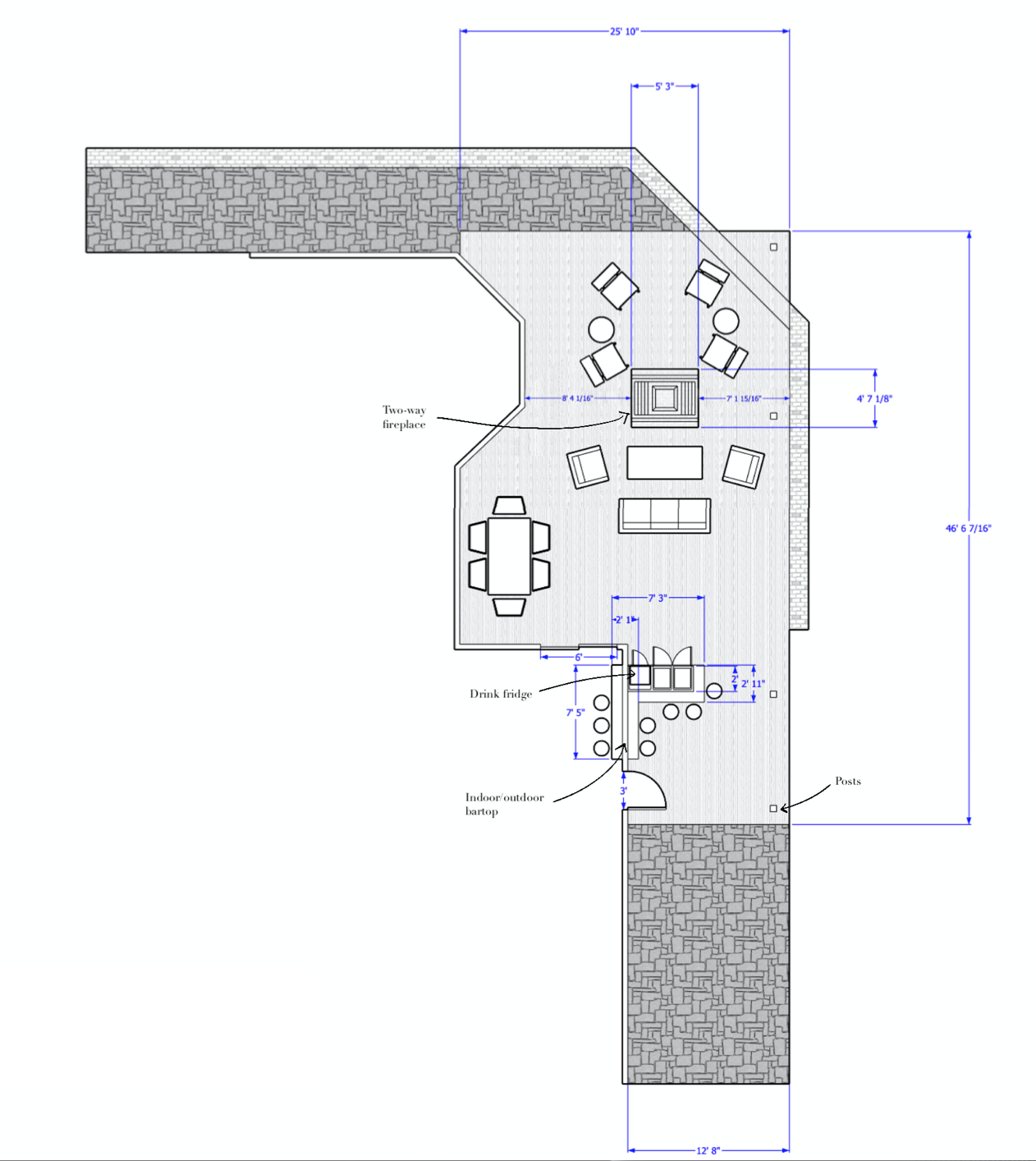 The clients’ were in need of a better space for friends and family to gather for hangouts and sporting events. The existing, uncovered, patio was not cutting it for their hosting needs. By covering the space and adding in a double-sided fireplace, the clients would be able to gather with friends while the kids had a sense of separation.